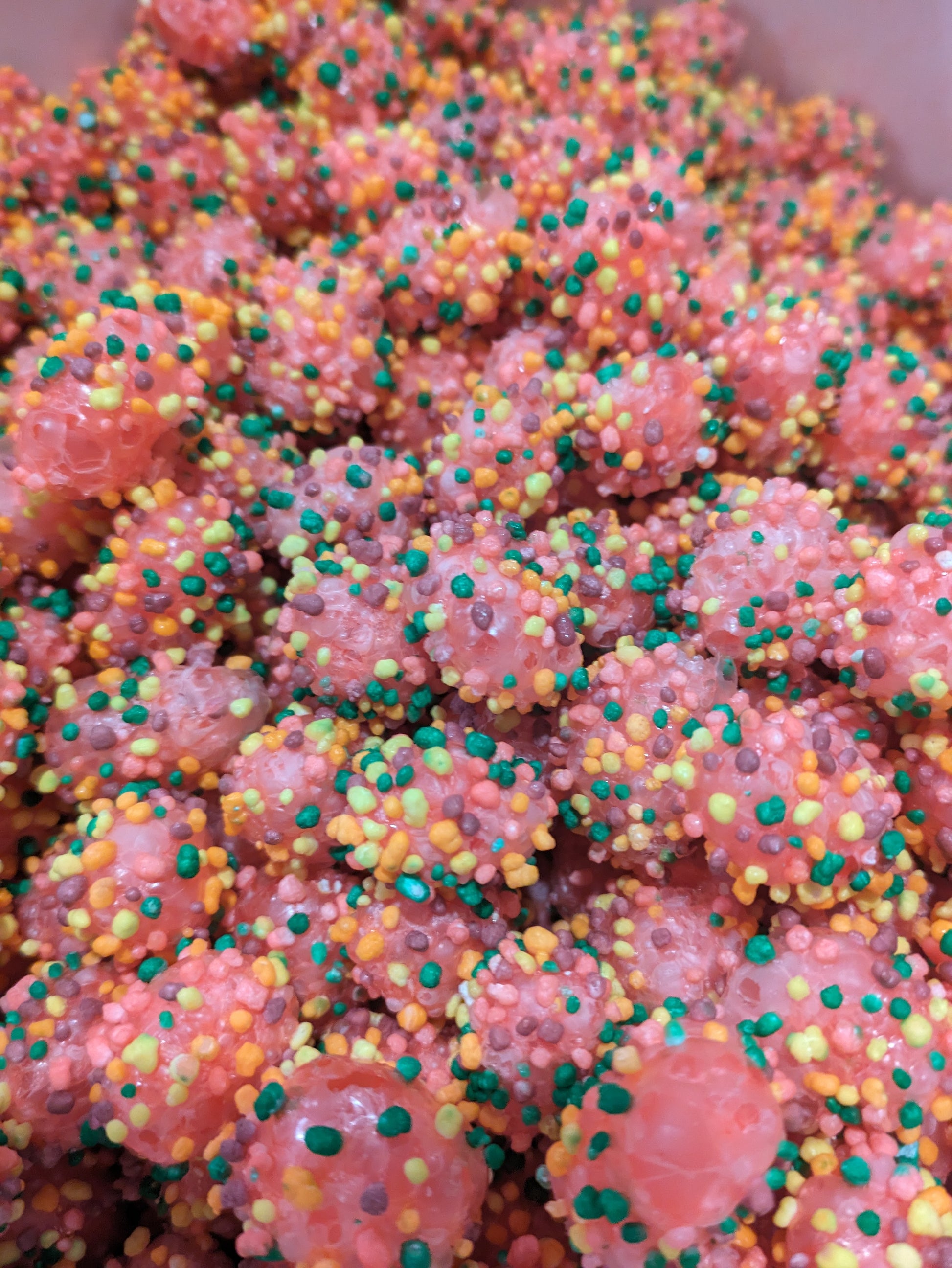 Sweet & Sour Gummy with candy non parels, freeze dried into cruncy goodness